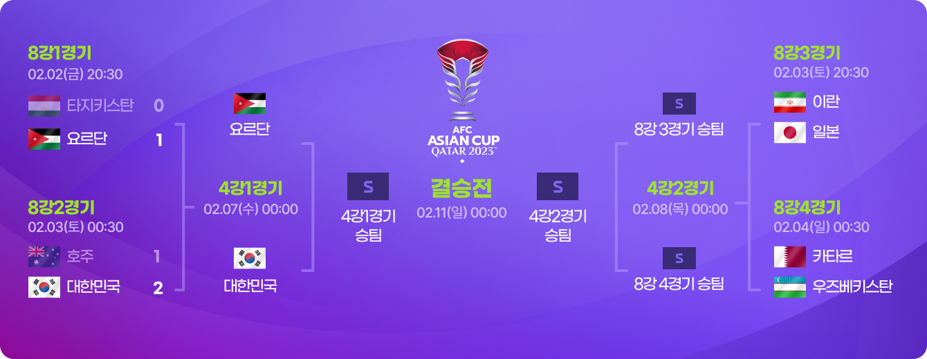 대한민국 vs 요르단 | 2월 7일 (수) 0시 (새벽) | 카타르 알 라이얀 |